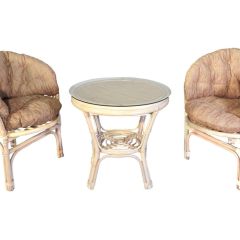 Комплект из натурального ротанга, состоящий из двух кресел и круглого столика с плетеной столешницей. Стекло входит в комплект.